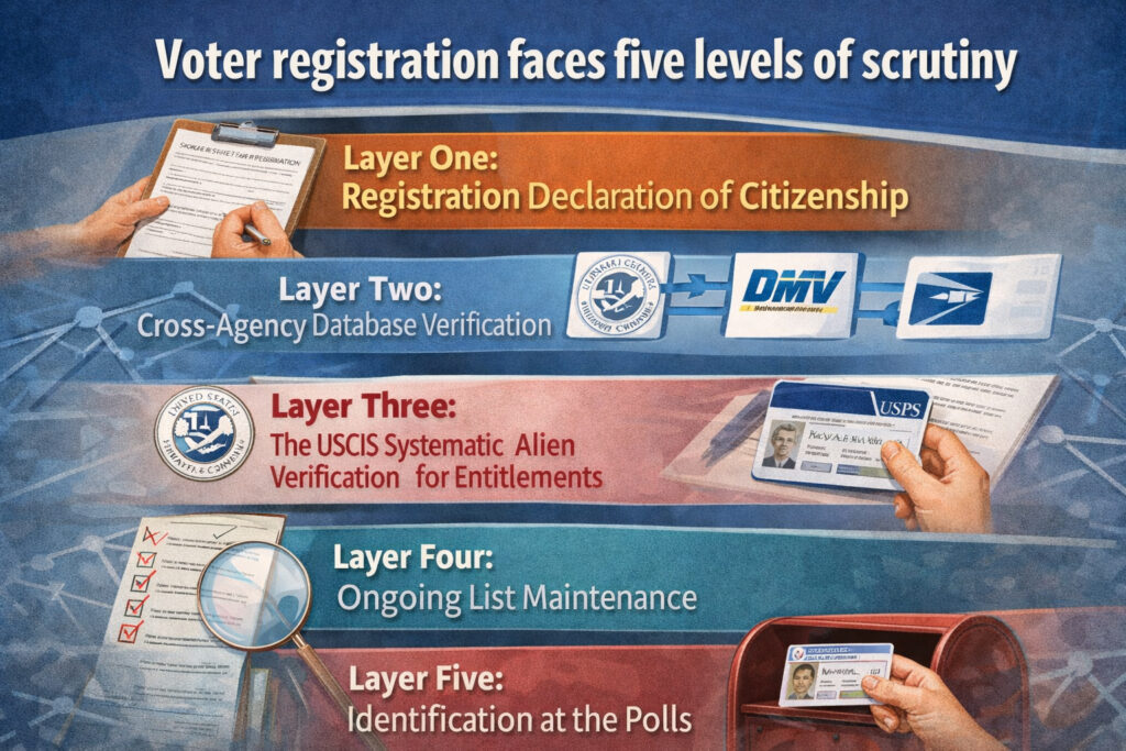 Every registration application is cross-referenced against multiple government databases. These include the Social Security Administration database, which verifies identity; the Department of Homeland Security’s immigration databases, which flag potential noncitizens; state motor vehicle databases, which verify driver’s license and ID information; the Social Security Death Master File, which identifies deceased individuals; and U.S. Postal Service change-of-address data, which identifies voters who have moved.