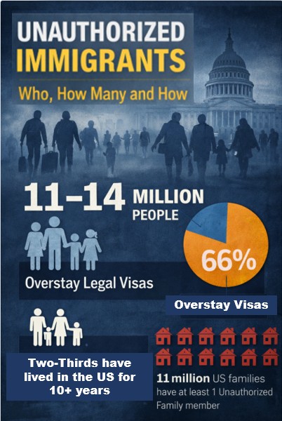 How did they get here? Contrary to popular belief, the majority in recent decades entered legally and then overstayed their visas. Nearly half of all undocumented immigrants came through official ports of entry, not across unguarded borders.